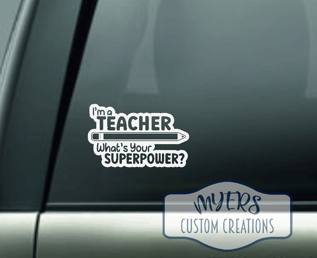 I'm a Teacher What's Your Superpower decal. Perfect for cars, laptops, or any other smooth surface. Approximately 5.5" wide by x 3" tall.